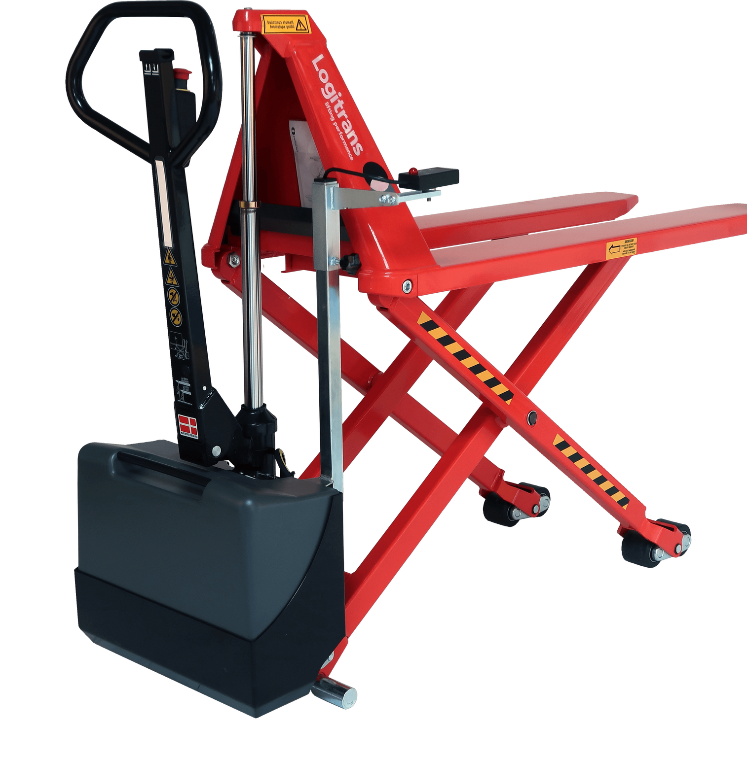 Le transpalette haute levée transporte et soulève la palette à hauteur idéale pour l'utilisateur tout en respectant, grâce à ses angles arrondis, l'espace de travail, les palettes et les marchandises. Sa construction réduit les accidents de travail et douleurs pour l'utilisateur. La sécurité et l'ergonomie de l'opérateur sont mises en avant. Par exemple le diamètre de prise du timon a été étudié pour réduire les douleurs aux poignets et aux épaules.